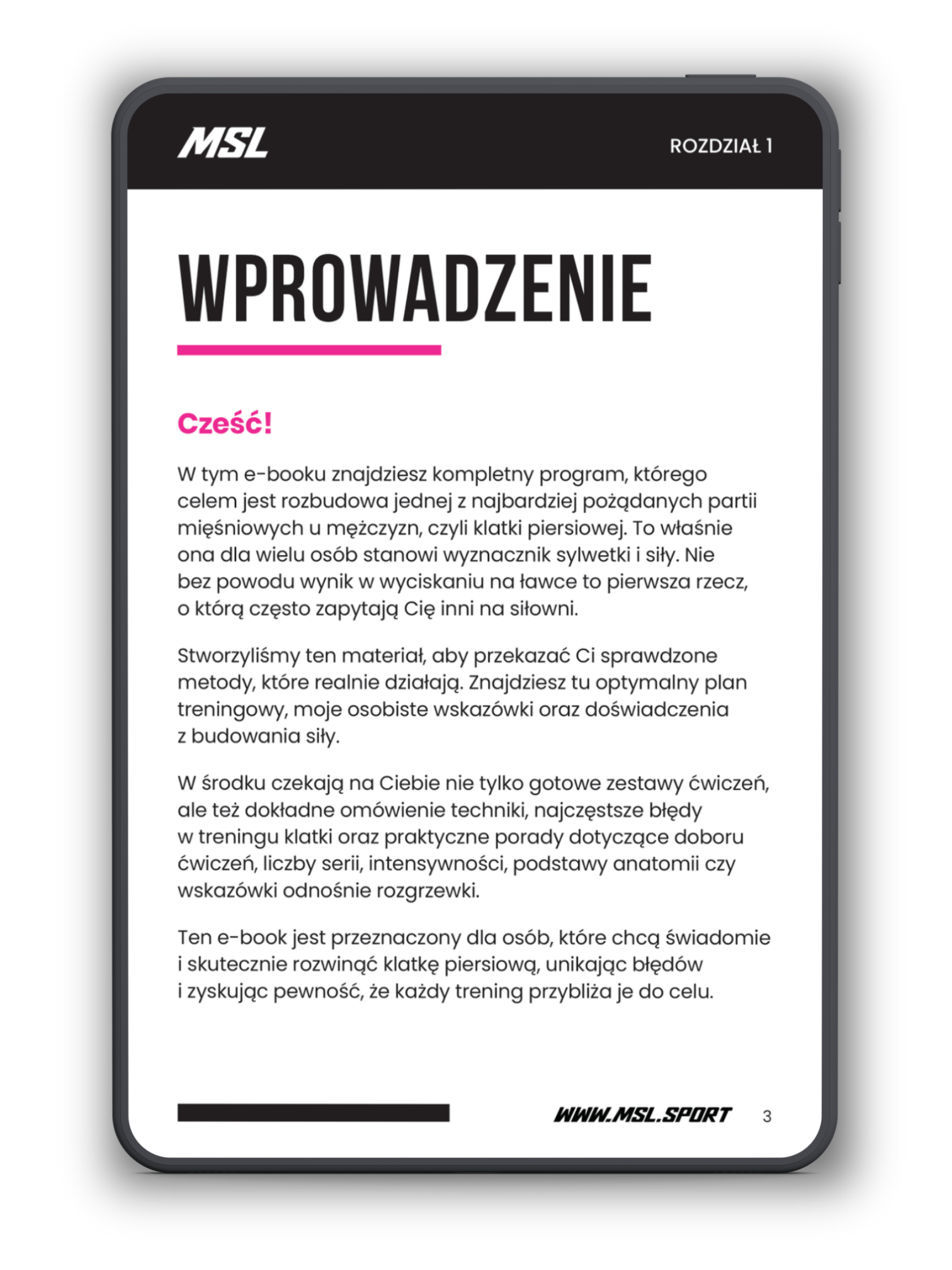 IRON CHEST kompletny 58-stronicowy e-book zawierający 10-tygodniowy program na klatkę piersiową, przygotowany z myślą o osobach, które chcą osiągnąć maksymalne efekty w budowie siły i masy mięśniowej. Ten e-book to kompletna baza wiedzy — od anatomii mięśni klatki, przez technikę i najczęstsze błędy, aż po gotowe plany i konkretne progresje oparte na badaniach naukowych. Wszystko po to, abyś trenował skutecznie, świadomie i bez marnowania czasu.