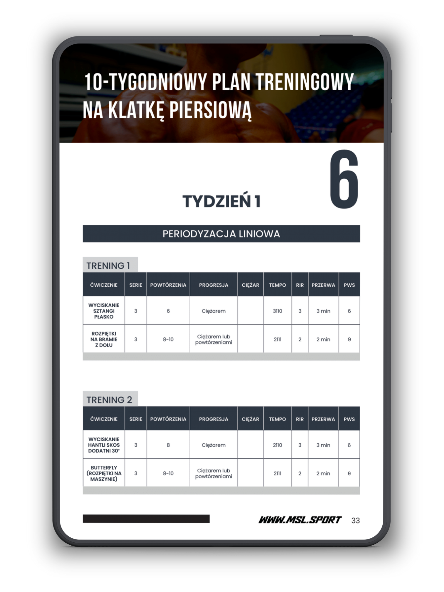 ✔ Gotowy 10-tygodniowy plan treningowy — dwa różne modele progresji, rozpisane serie, powtórzenia, tempo, RIR i PWS dla pełnej kontroli objętości